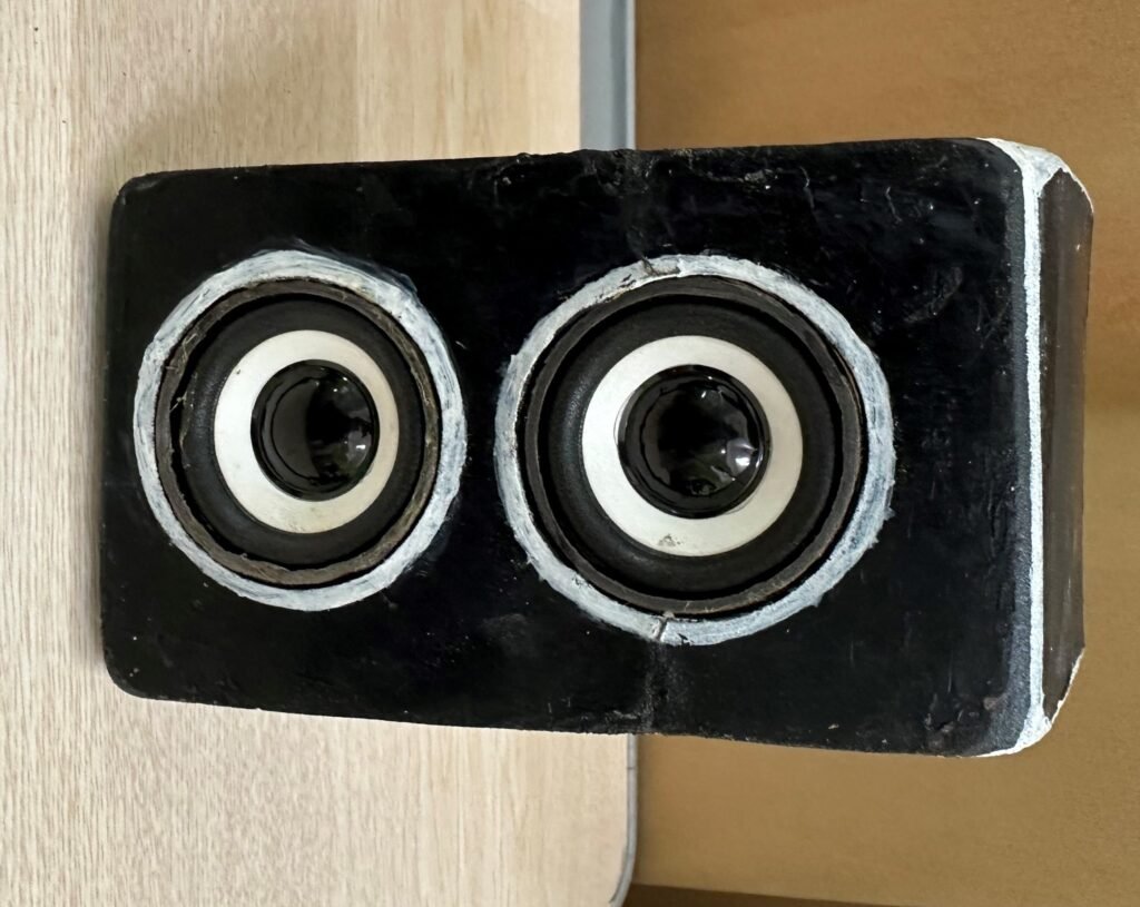 A box for the speakers with two holes for the speaker heads was made using wood. Dimensions were drawn on the wood and cut accordingly. The wood pieces were stuck and made into a box. Soldering of the components in the circuit was done in the following manner: The speaker heads were stuck around the holes and the rest of the components in the box. An opening for the switch and the charging port at the back of the speaker  was made.